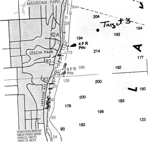 - Intro - Target 1 - Target 2 - Target 3 -Location.Target three is located on the west side of the lake, north of Leshi. It rests in 210 feet of water. Target 3 is 60 feet long and rises approximately 5-10 feet off the bottom. Based on our research and video documentation, we believe the site is the remains of a turn off the century passenger steamer, either the Acme or L .T. Haas.History.The Acme was built in Seattle in 1899. She was 60 feet long and carried passengers on Lake Washington between Leshi, Madison Park and Bothell. She was owned and operated by N. C. Peterson. The Acme burned and sank off Leshi in 1908. The L. T. Haas was 60 feet long and carried passengers on Lake Washington between Leshi Park and Maydenbaer Bay. The L. T. Haas was owned and operated by Carlson Brothers. Like the Acme, she burned and sank off Leshi in 1909.