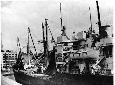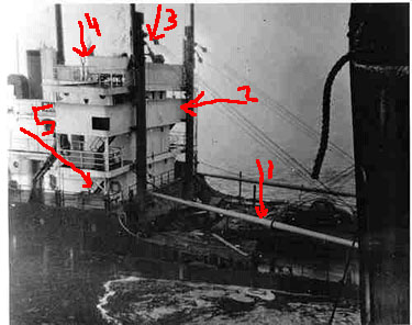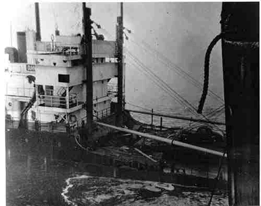 In the fateful summer of 1947, she was loaded with 154,316 cases of valuable canned fish at the Bristol Bay Ports of Alaska. The cargo of 7,407,168 cans of red, king, chum and coho salmon - was valued at $3.5 million in 1947 dollars. She was also loaded with other cargo including lumber, cannery equipment and thousands of labels. In addition, her deep tanks were filled 50,000 gallons of fish oil, and her deck cargo carried a small tugboat, an automobile and 155 barrels of salt fish. All cargo was headed for Seattle. The start of the voyage was uneventful and after a 26 hour run across Bristol Bay she turned due south through Unimak Pass into the northern Pacific. She changed course and then headed into the entrance of the Strait of Juan de Fuca. The seas in the straits were running particularly heavy on the night of Aug. 12th. As she entered, dense fog kept the entrance marker buoy and the shores of both Washington and Vancouver Island (Canada) from her sights. In the early hours of Aug. 13th, the Knot was just a few miles south of Race Rock, just north of the of the prescribed traffic lane for inbound traffic. Plowing through the dense fog, outbound from Seattle for the Pacifc, came the 10,681 ton Fenn Victory (nearly twice the size of the Knot). The Fenn Victory was only slightly loaded with 200 tons of cargo, causing her bow to ride high out of the water as she headed seaward. With no warning, as the crews busily worked their vessel decks, the Fenn Victory collided with the Diamond Knot in the dark, pre-dawn fog. The bow of the Fenn Victory, towering high in the water, tore through 14 feet of the Diamond Knot and became entangled in the heavy crosstree of the even heavier midship kingpost. The reinforced decking, heavy cargo machinery and kingposts and booms in this location probably kept the Knot from being cut completely through.