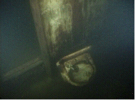 ![]() Numbers on side of hull near bowThe wheelhouse and cabins above the main hull are missing, probably as a result