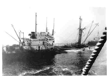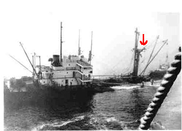 In the fateful summer of 1947, she was loaded with 154,316 cases of valuable canned fish at the Bristol Bay Ports of Alaska. The cargo of 7,407,168 cans of red, king, chum and coho salmon - was valued at $3.5 million in 1947 dollars. She was also loaded with other cargo including lumber, cannery equipment and thousands of labels. In addition, her deep tanks were filled 50,000 gallons of fish oil, and her deck cargo carried a small tugboat, an automobile and 155 barrels of salt fish. All cargo was headed for Seattle. The start of the voyage was uneventful and after a 26 hour run across Bristol Bay she turned due south through Unimak Pass into the northern Pacific. She changed course and then headed into the entrance of the Strait of Juan de Fuca. The seas in the straits were running particularly heavy on the night of Aug. 12th. As she entered, dense fog kept the entrance marker buoy and the shores of both Washington and Vancouver Island (Canada) from her sights. In the early hours of Aug. 13th, the Knot was just a few miles south of Race Rock, just north of the of the prescribed traffic lane for inbound traffic. Plowing through the dense fog, outbound from Seattle for the Pacifc, came the 10,681 ton Fenn Victory (nearly twice the size of the Knot). The Fenn Victory was only slightly loaded with 200 tons of cargo, causing her bow to ride high out of the water as she headed seaward. With no warning, as the crews busily worked their vessel decks, the Fenn Victory collided with the Diamond Knot in the dark, pre-dawn fog. The bow of the Fenn Victory, towering high in the water, tore through 14 feet of the Diamond Knot and became entangled in the heavy crosstree of the even heavier midship kingpost. The reinforced decking, heavy cargo machinery and kingposts and booms in this location probably kept the Knot from being cut completely through.