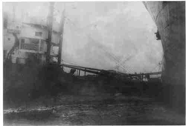Despite this, the deep gash on the Knot's side was a fatal one. Her decks were down and completely awash before the rescue tug Salvage Chieftain arrived and cut the vessels apart. Two sea going tugs, Matilda Foss and the Foss 21 then took the sinking Knot in tow and headed for the shallower, protected waters of Crescent Bay. They were not destined to make it. Just off Tongue Point Reef, at the eastern side of the entrance to Crescent Bay, the strong currents caught the salvors and the Knot in its grip. It spun the sinking vessel broadside to the current and pulled the already sinking starborad side completely underwater. The Knot then sank quickly, settling on her starboard side in about 135 feet of water, where she lies today.
