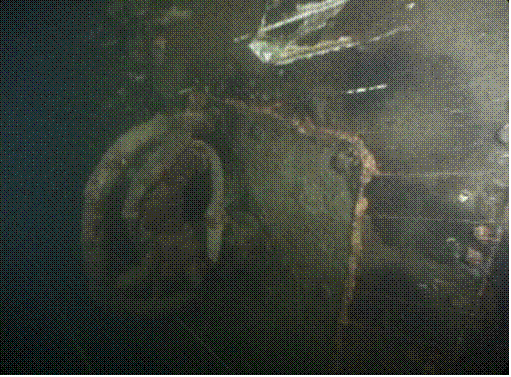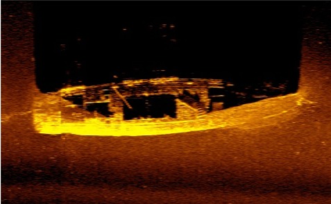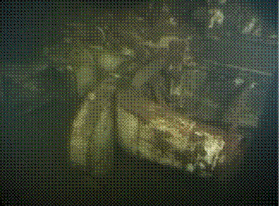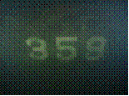 Side scan image of YMS-359 provided by Innerspace Exploration TeamYMS-359 is located in the middle of the lake straight out from Houghton (present day Carillon Point). The wooden hull is completely intact. It is still Navy gray and has the numbers “359” on either side of the bow, similar to YMS 324 and 313 in the pictures above. The hinge plates for the acoustic “hammer box" are on either side of the bow near the bottom of the hull. The “hammer box’ devices were used to detonate some types of mines.