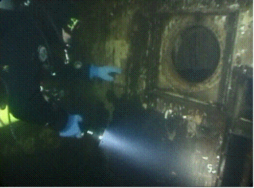 ![]() SCRET diver Walter Jaccard inspects inside cabin window with